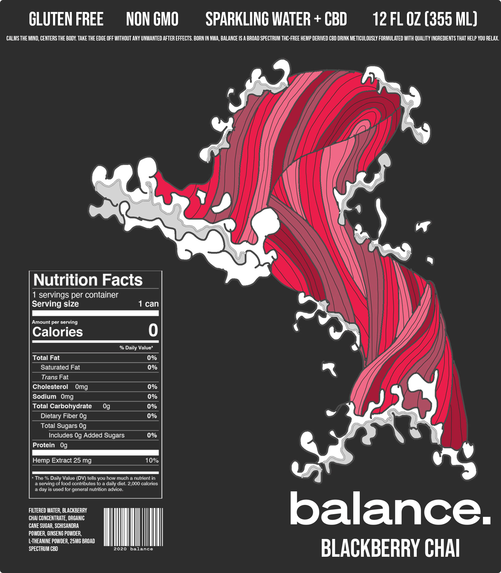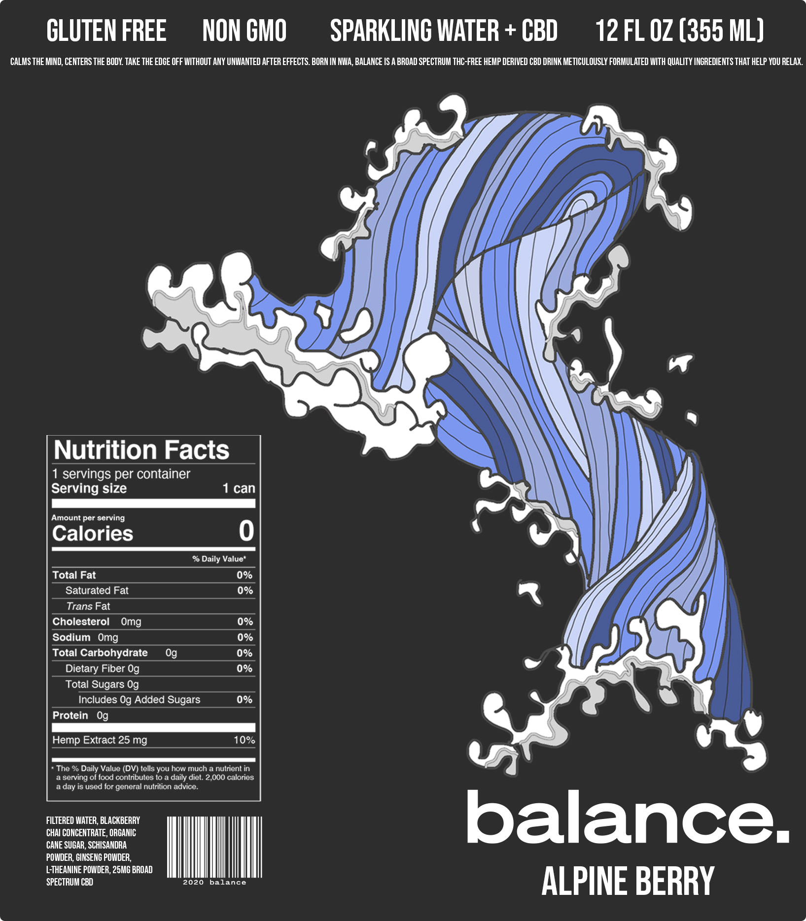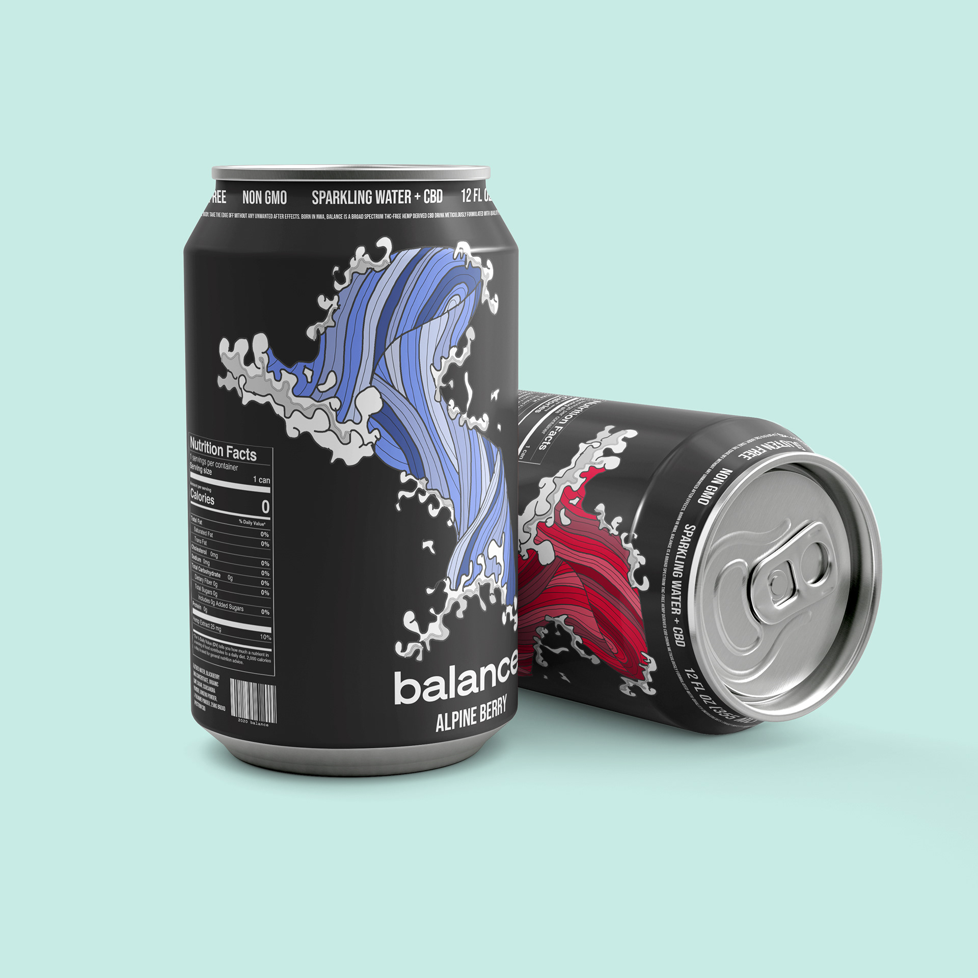 A trio of illustrative designs for a hypothetical sparkling water company called balance.
